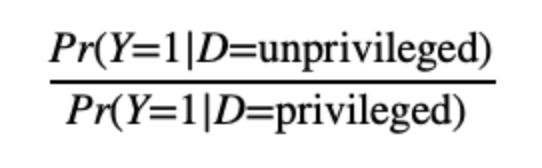 Disparate impact requires the pass rate to be similar across different groups. It is quantified by taking the proportion of the pass rate of the group of interest to that of a baseline group. Typically, in the context of fairness, the group of interest is an underprivileged group, and a baseline group is a privileged group.