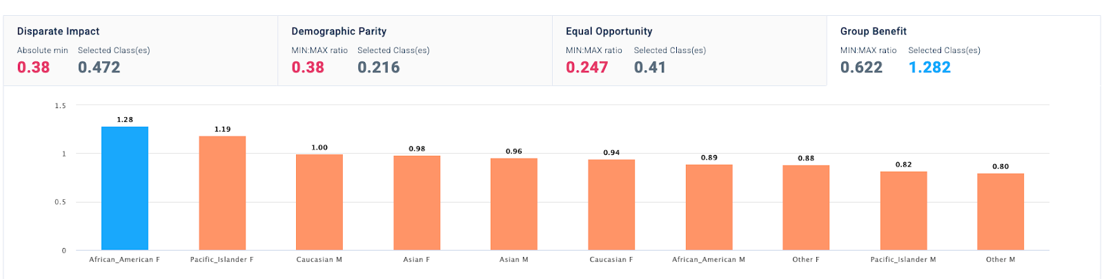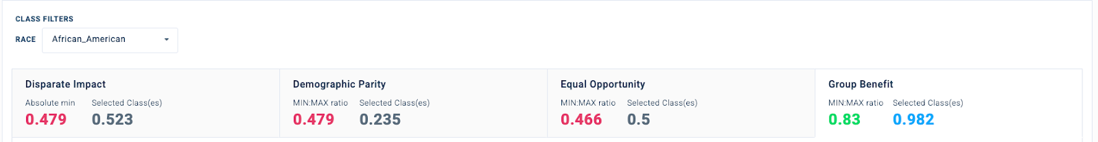 Given such an ML model, Fiddler allows one to evaluate their model for fairness based on a variety of metrics. Since there is no single definition of fairness, we allow model designers to make decisions on which metric is most appropriate based on their application context and use cases. Our built-in fairness metrics include disparate impact, demographic parity, equal opportunity, and group benefit.