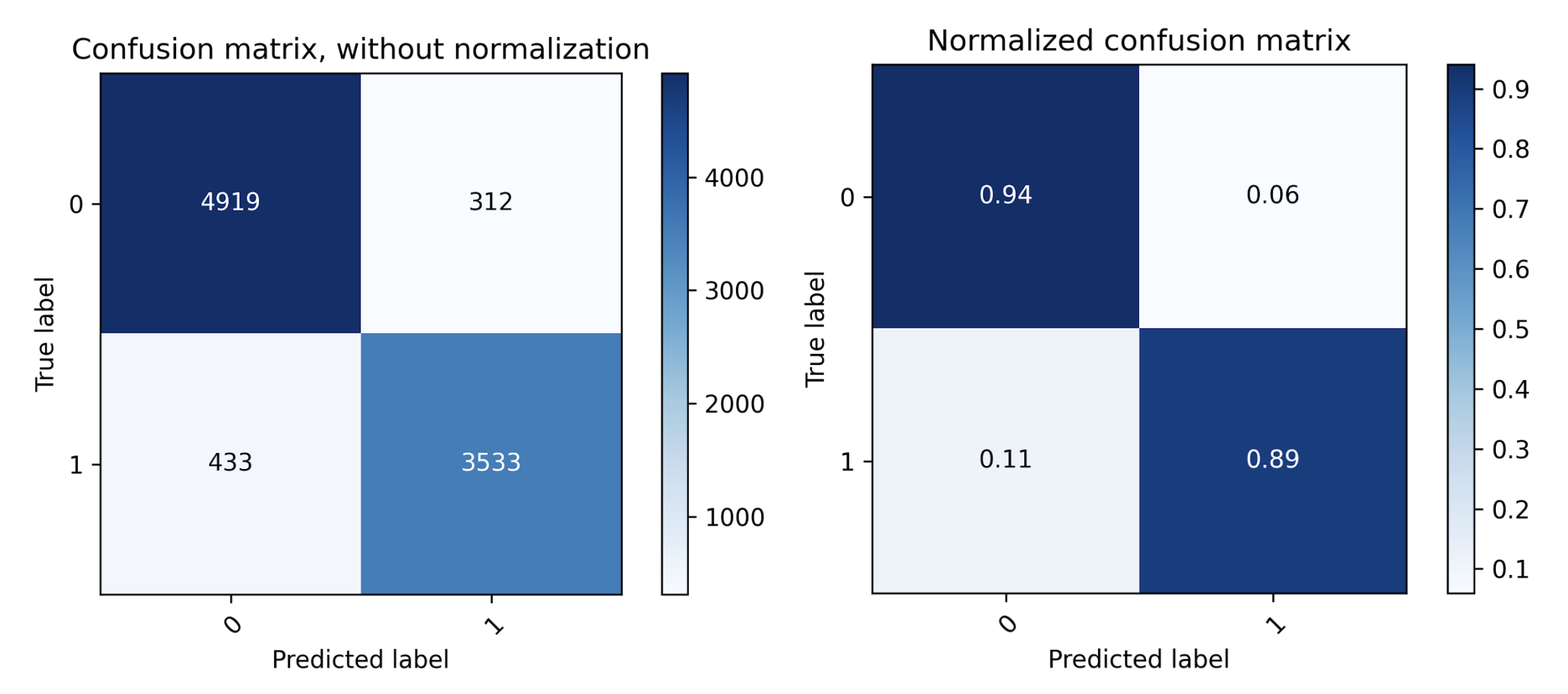 We reserve 20% of the dataset for testing (9,197 rows) and train the model with the remaining 80% (36,788 rows). We get the following confusion matrix and performance metrics on test data upon training the model.